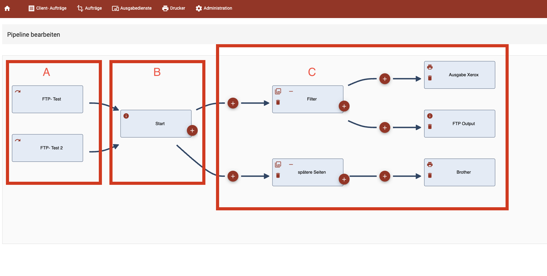 Die Ansicht gliedert sich in den Bereich A, der die verwendeten Warteschlangen anzeigt, den Bereich B, der den Start des Prozesses anzeigt und den Bereich C, der die individuellen Schritte darstellt.