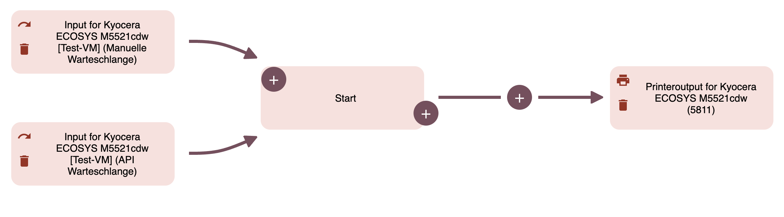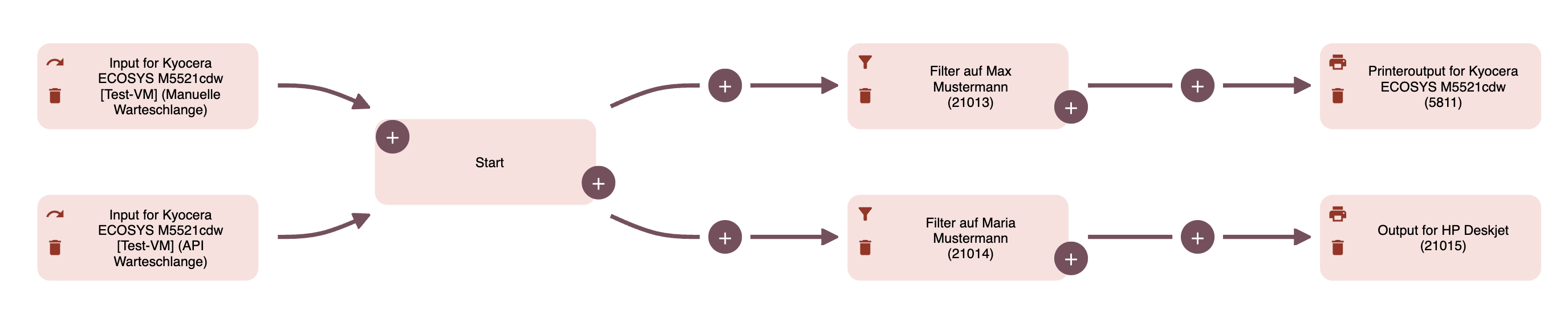 Druckaufträge, die an eine der Warteschlangen "Input for Kyocera ECOSYS M5521cdw" gesendet werden, durchlaufen nun die Pipeline und werden anhand der Filter auf einen der beiden Drucker umgeleitet.