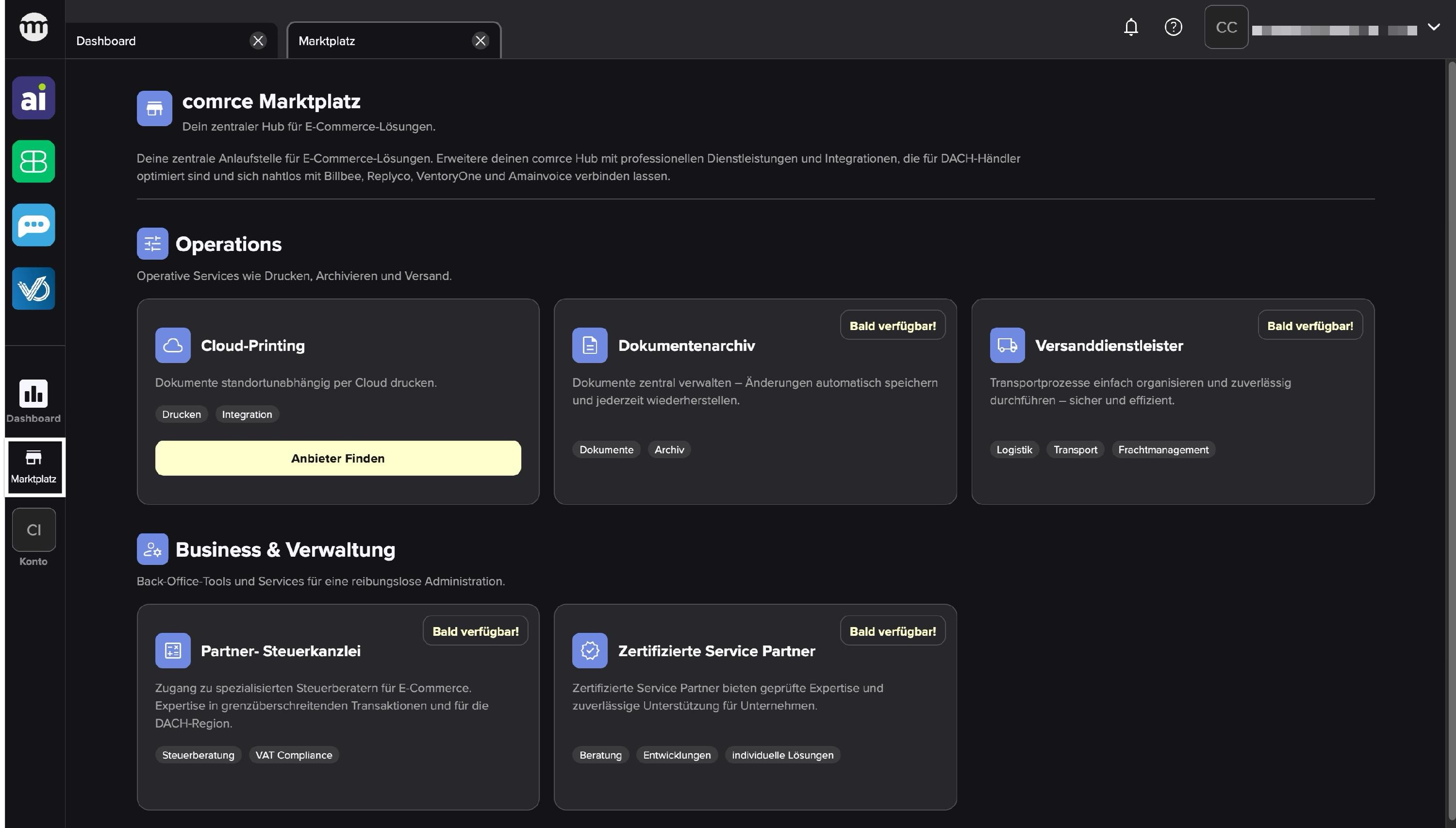 Klicke auf die Schaltfläche "Marktplatz", um zum comrce Marktplatz zu gelangen. Deine zentrale Anlaufstelle für E-Commerce-Lösungen. Erweitere deinen comrce Hub mit professionellen Dienstleistungen und Integrationen, die für DACH-Händler optimiert sind und sich nahtlos mit Billbee, Replyco, VentoryOne und Amainvoice verbinden lassen.