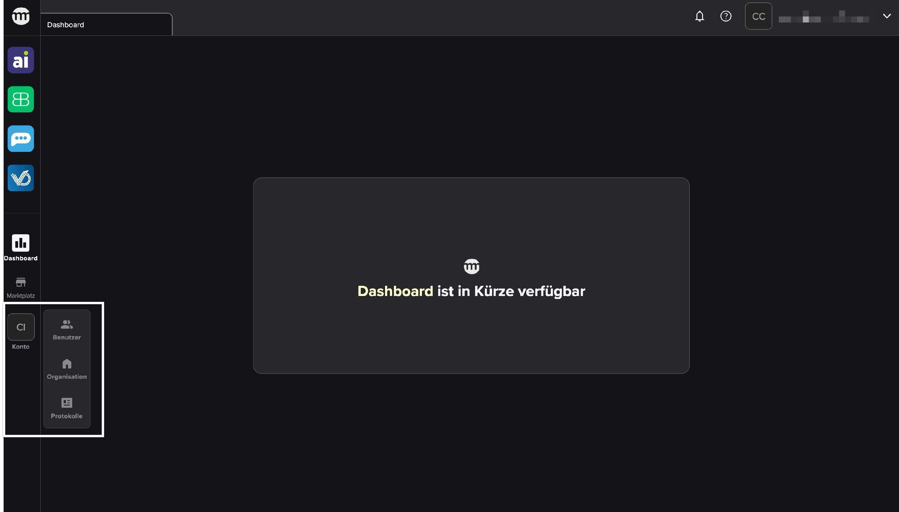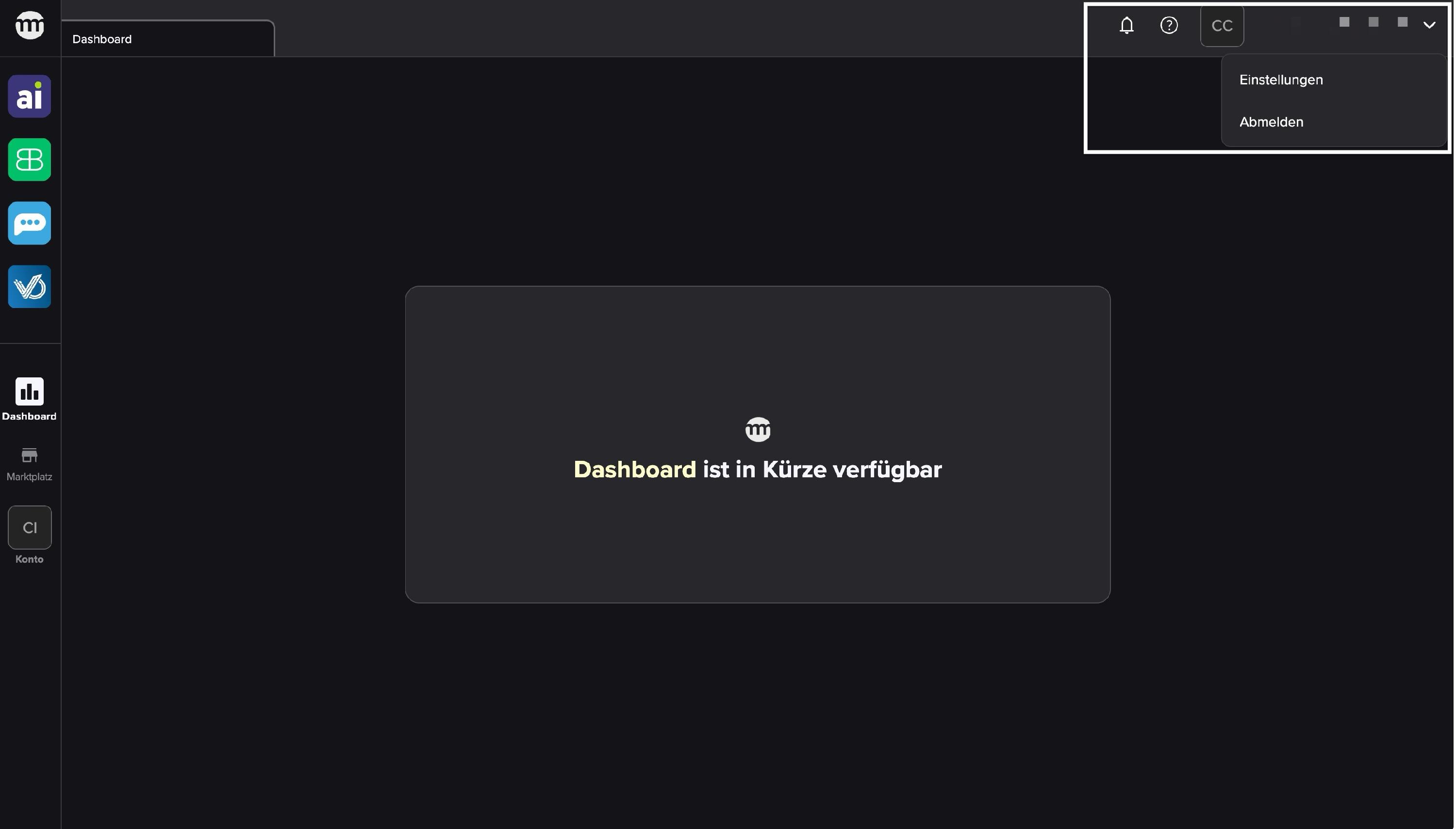Über die Symbole (Glocke & Fragezeichen) oben rechts gelangst du zu den Benachrichtigungen und zum Hilfecenter. Dort verwaltest du zudem dein Benutzerprofil und kannst den Logout durchführen.