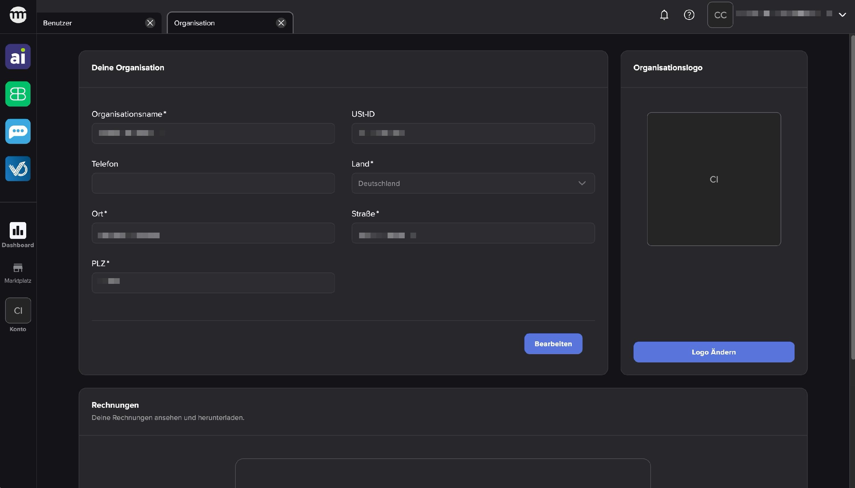Organisationseinstellungen: Organisationseinstellungen: Hier hinterlegst du die Stammdaten deiner Organisation, hinterlegst ein Logo und kannst deine Rechnungen einsehen sowie herunterladen.