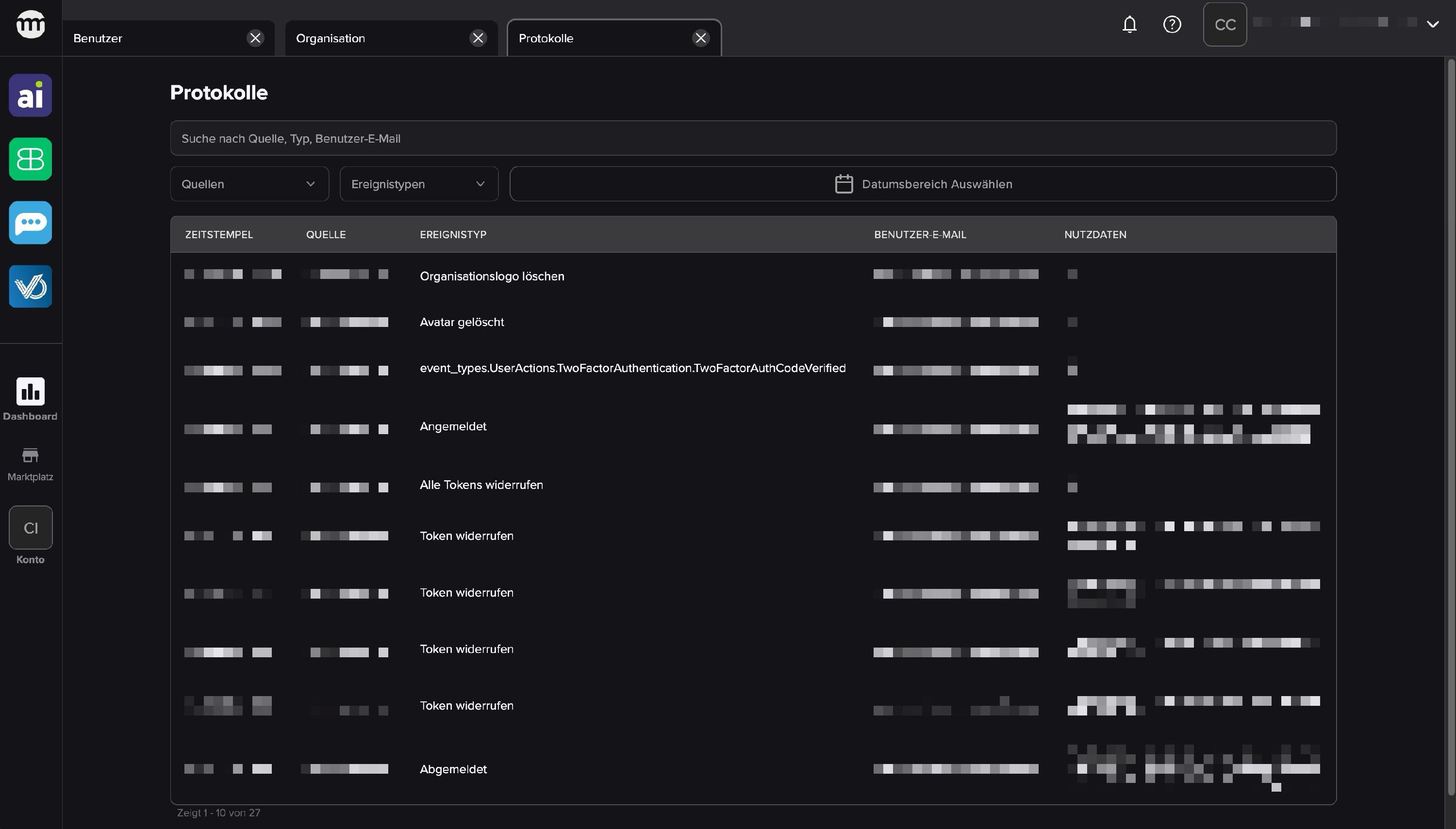Protokolle: Die Aktivitätshistorie deines comrce Hub Kontos.