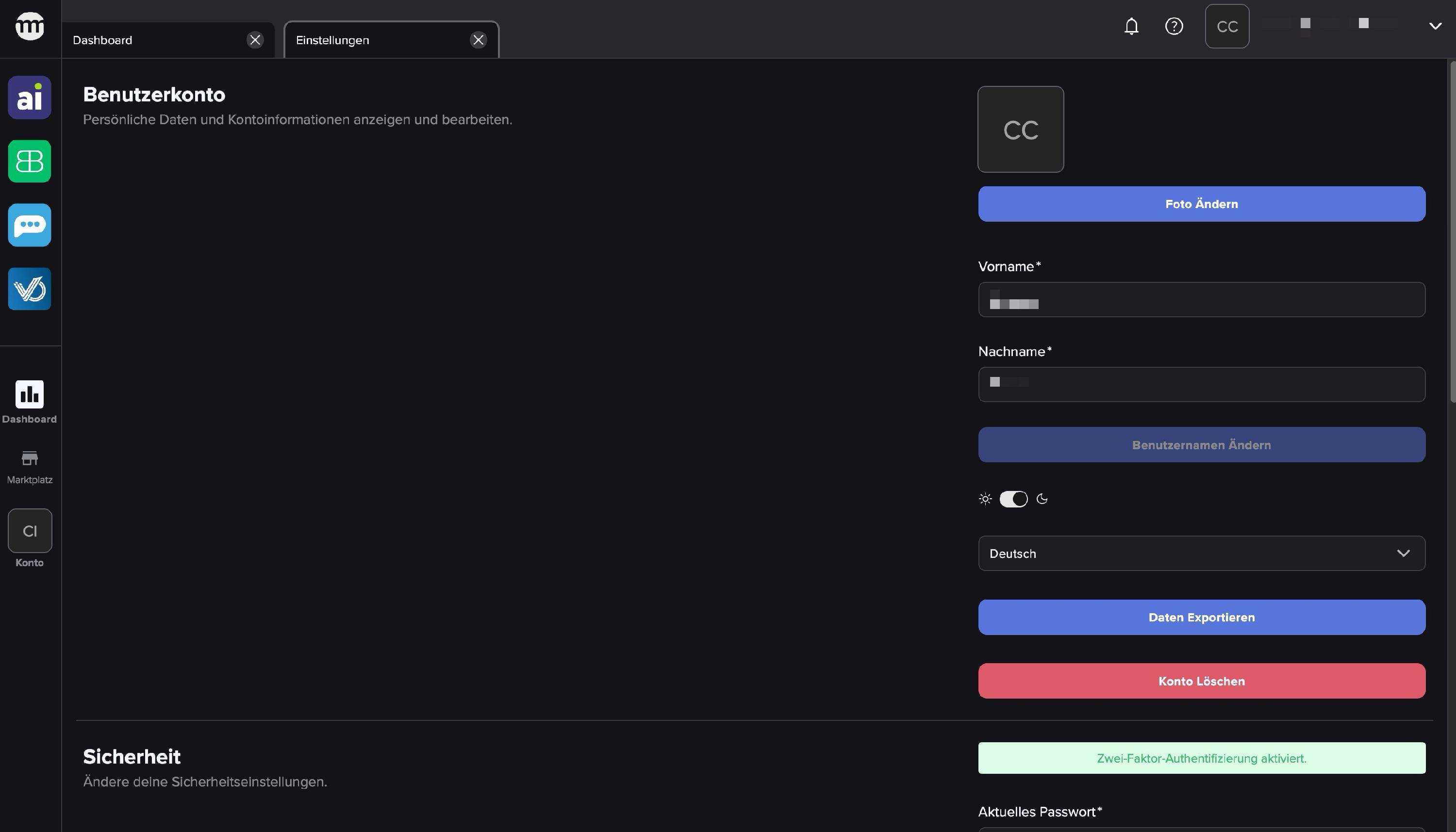 In den Benutzerkontoeinstellungen kannst du dein Profil personalisieren: Lade ein Foto hoch, gib deinen Namen an und wähle zwischen Light- und Darkmode sowie deiner bevorzugten Sprache. Zudem hast du hier die volle Kontrolle über deine Daten – du kannst sie jederzeit exportieren oder dein Konto löschen.
