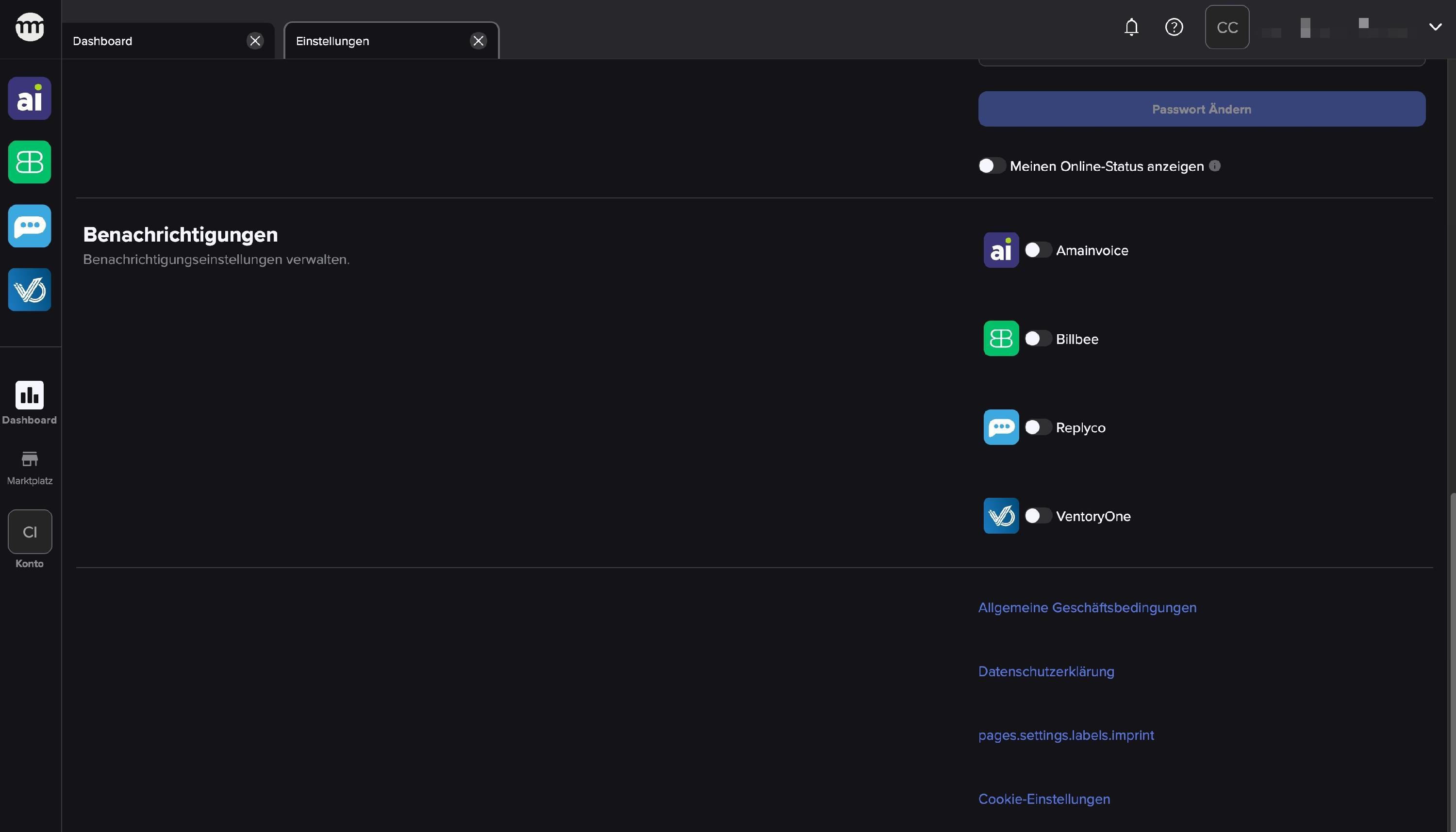 Über die linke Seitenleiste öffnest du Apps wie Billbee, Amainvoice, Replyco oder VentoryOne bequem als Tab direkt im comrce Hub.